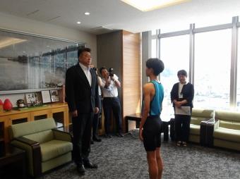 8日に行われる北信越中学校陸上競技大気男子800mに出場する源さんへの激励会が、4日能登町役場で行われました。吉田町長から激励の言葉をいただきました。目標である2分をきってほしいです。がんばれ源さん。